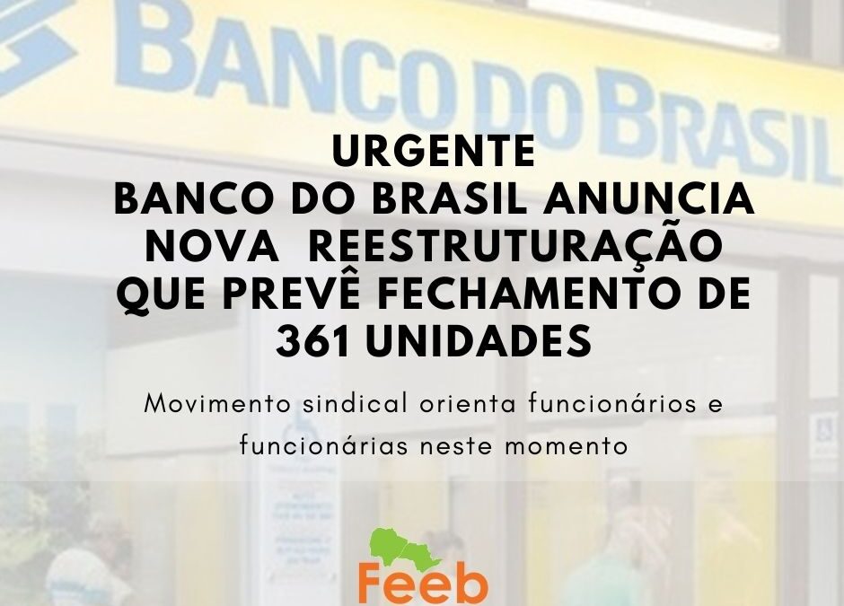 Nesta manhã a Federação dos Empregados em Estabelecimento Bancário dos Estados de São Paulo e Mato Grosso do Sul, tomou conhecimento de comunicado ao mercado da nova reestruturação anunciada pelo Banco do Brasil. As mudanças preveem a desativação de 361 unidades e desligamento de cerca de cinco mil trabalhadores. Se mantida, a decisão do Banco, além de prejudicar milhares de funcionários e funcionárias, impactará toda a sociedade com o fechamento das agencias. O movimento sindical encontra-se neste momento em reunião para orientar a categoria para resistir às ameaças, ataques e tentativas de supressão de direitos.