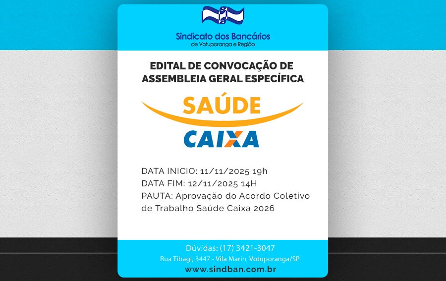 Sindicato dos Empregados em Estabelecimentos Bancários de Votuporanga , inscrito no CNPJ/MF sob o nº 49.074.172/0001-07, Registro sindical nº006.132.86.232-7 por seu presidente abaixo assinado, convoca todos os bancários beneficiários titulares do Saúde Caixa, sócios e não sócios, da base territorial deste sindicato, que prestam serviço para a Caixa Econômica Federal para a reunião assemblear específica remota a ser realizada nos dias 11 e 12 de novembro de 2025 com votação das 19:00 horas do dia 11.11.2025 até às 14:00 horas do dia 12.11.2025, precedida de plenária no dia 11.11.2025 de forma remota, para deliberação da seguinte pauta: Aprovação do Acordo Coletivo de Trabalho Saúde Caixa 2026 com vigência de 1º de janeiro de 2026 a 31 de agosto de 2026, na forma disposta no site oficial do Sindicato na internet www.sindban.com.br .